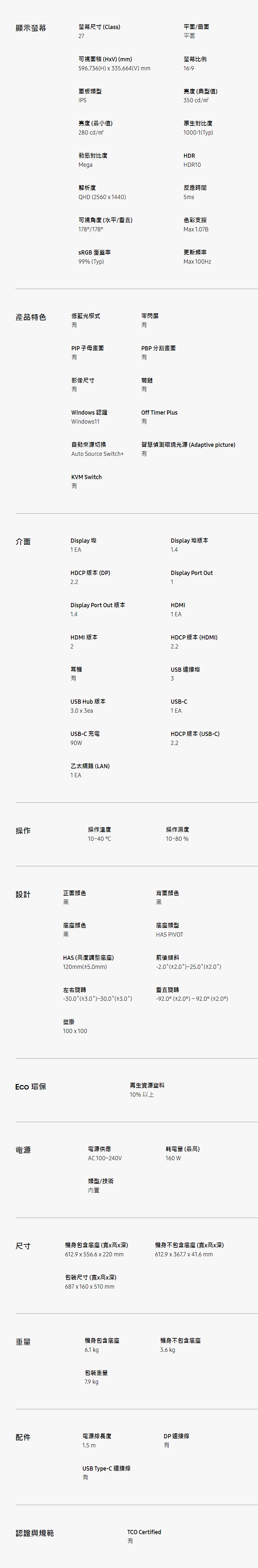 2560×1440 QHD解析度呈現流暢的視覺效果 90W Type-C連接埠讓傳輸、充電更方便 快速安裝底座,輕鬆安裝不費力 人體工學設定,舒適的觀看螢幕