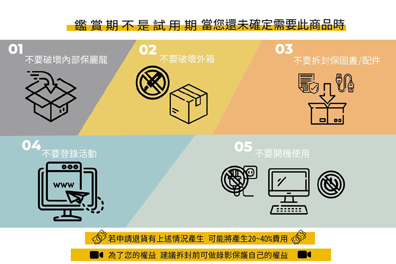 – 鑑賞期非試用期 – 鑑賞期內請保持商品/配件/贈品的完整性 (包裝不可破損,不可包膜,商品不可磨損刮傷) – 如退回之商品不完整,將影響您的退貨權益 – 賣場商品介紹及規格,僅供參考,請以原廠官方公佈資料為準