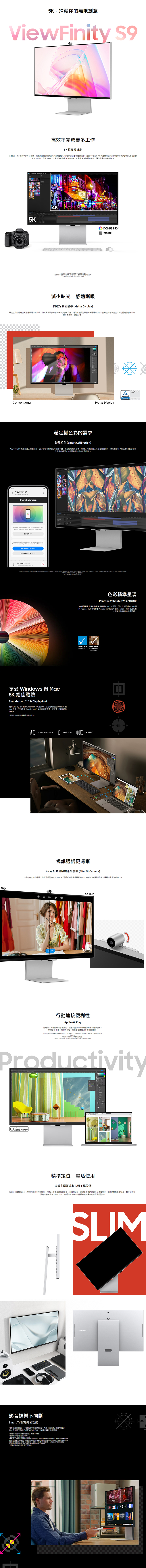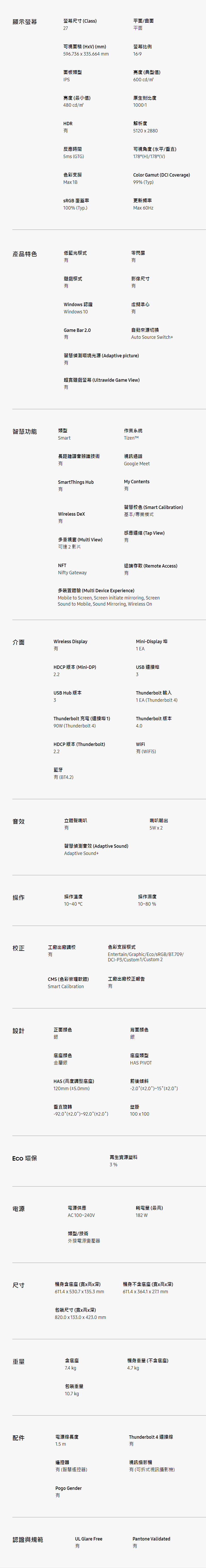 5K 解析度 (5,120 x 2,880) & DCI-P3 99% 通過UL Glare Free 無眩光認證 通過Pantone Validated 彩通認證 支援SmartThings 智慧校色 (Smart Calibration) 多種連接埠 (90W Thunderbolt 4, Mini-DP) 內附 4K UHD 可拆式磁吸視訊攝影機 智慧電視功能 (Smart TV),影音娛樂不間斷 支援手機直立滿版無線投影