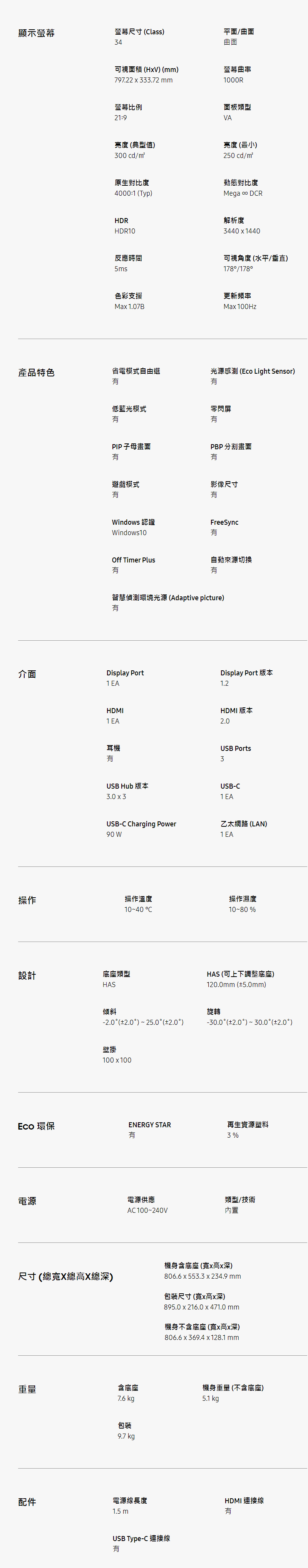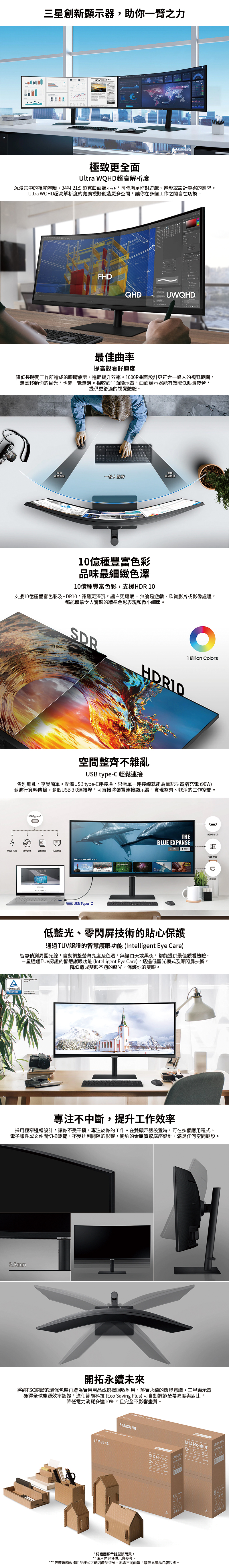 Ultra WQHD (3440 x 1440) 超高解析度 支援10億種豐富色彩及 HDR10 配備 USB Type-C 連接埠及網路埠
