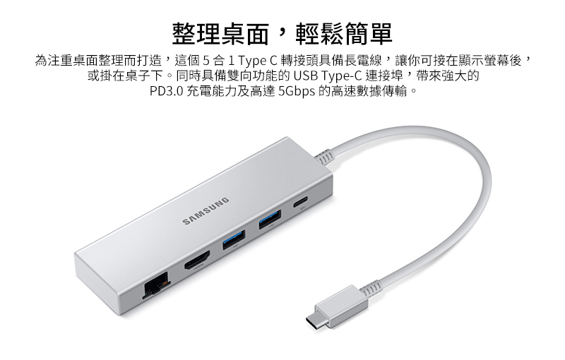 為注重桌面整理而打造 具備雙向功能的 USB Type-C 連接埠 PD3.0 充電能力及高達 5Gbps 的高速數據傳輸