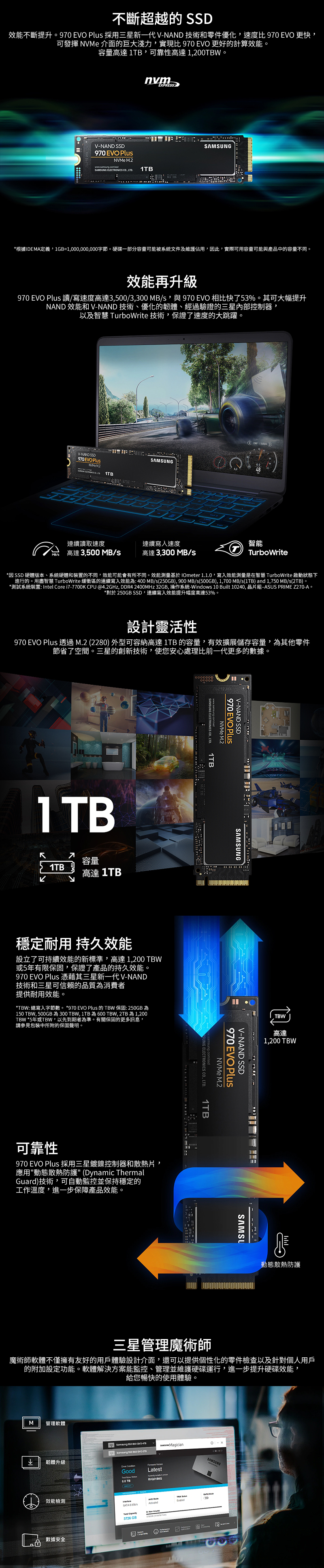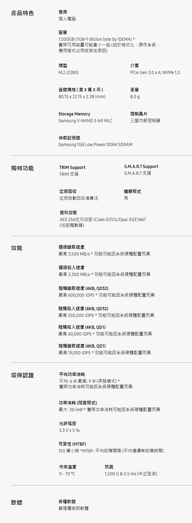 ※儲存產品欲退貨,退回的商品必須為全新未拆封且未使用狀態 採用最新的 V-NAND 技術與三星內部控制器 讀取速度最高達3,500MB/s,寫入速度最高達3,300MB/s 3-bit MLC 快閃記憶體