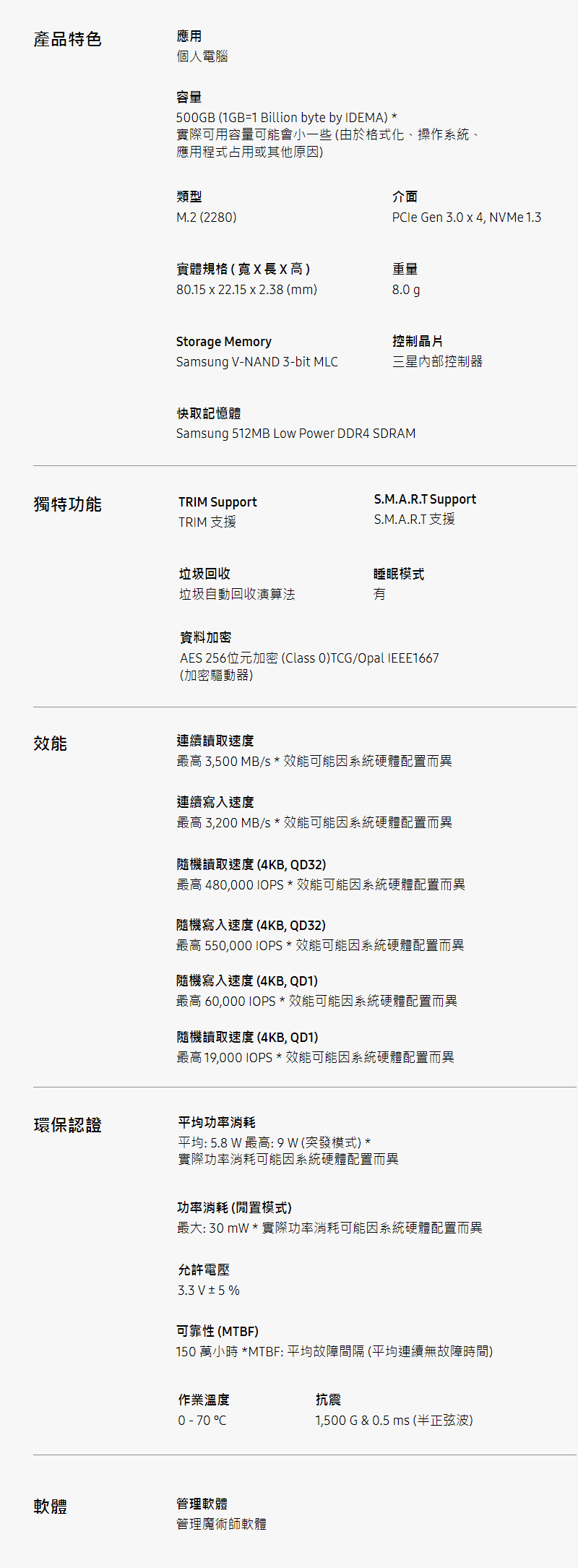 ※儲存產品欲退貨,退回的商品必須為全新未拆封且未使用狀態 採用最新的 V-NAND 技術與三星內部控制器 讀取速度最高達3,500MB/s,寫入速度最高達3,200MB/s 3-bit MLC 快閃記憶體