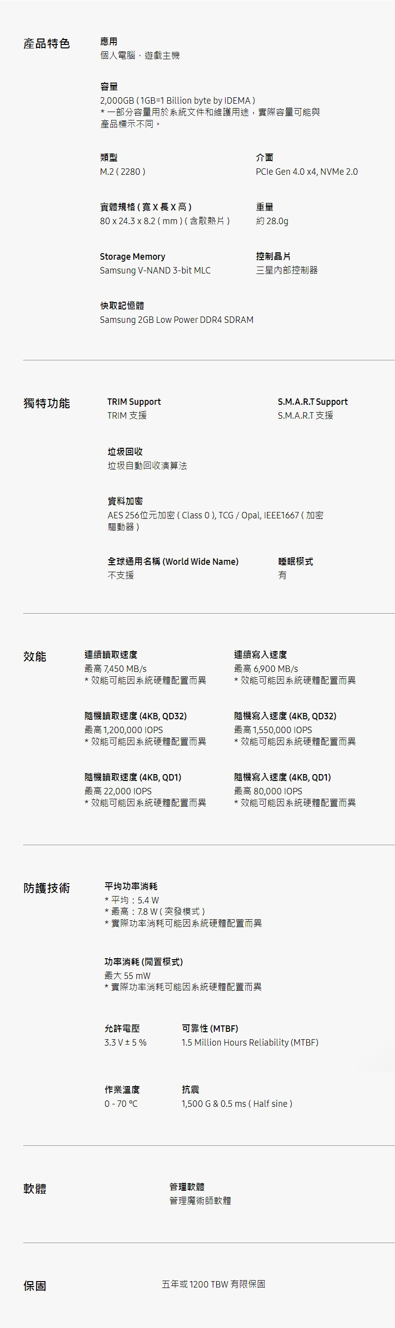 ※※※ 請注意!儲存產品欲退貨,退回的商品必須為全新未拆封且未使用狀態 ※※※ 全新設計三星內部控制器的 NVMe 固態硬碟 高達 7,450 / 6,900 MB/s 的讀 / 寫速度 極致高效固態硬碟 智慧動態散熱控制