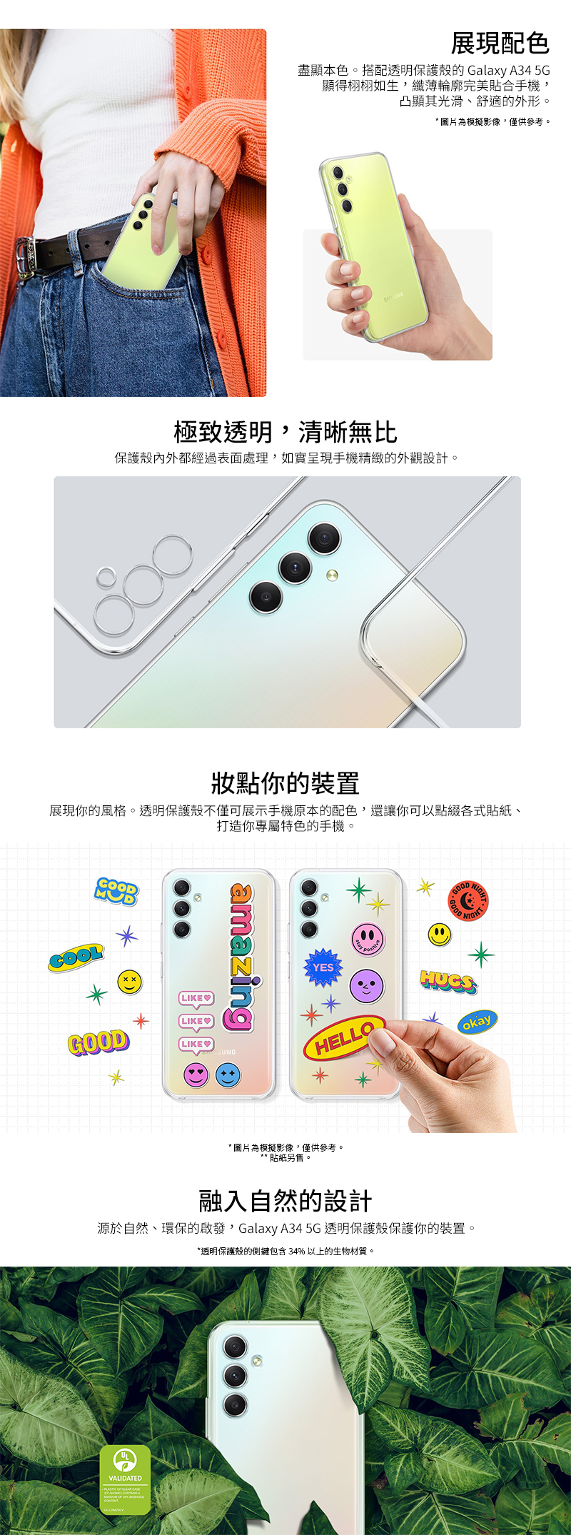 保護殼內外都經過表面處理,如實呈現手機精緻的外觀設計 透明保護殼不僅可展示手機原本的配色,還讓你可以點綴各式貼紙、打造你專屬特色的手機 融入自然的設計,使用再生材料製作 賣場商品介紹及規格,僅供參考,請以原廠官方公佈資料為準
