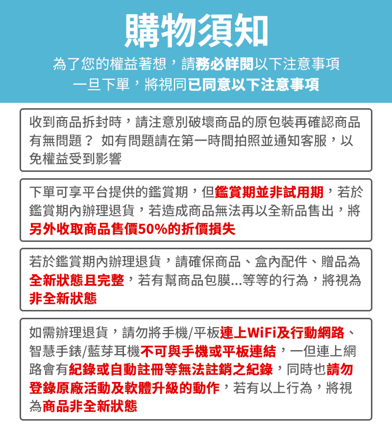 – 鑑賞期內請保持商品/配件/贈品的完整性 (包裝不可破損,不可包膜,商品不可磨損刮傷)