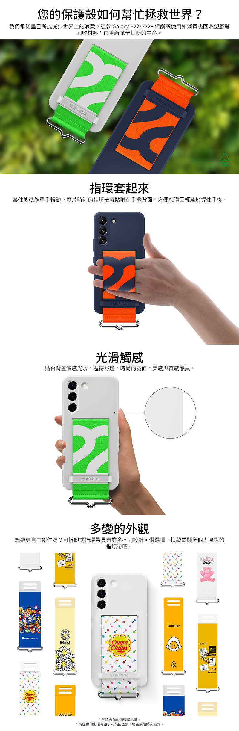 使用如消費後回收塑膠等回收材料,再重新賦予其新的生命 寬片時尚的指環帶就貼附在手機背面,方便您穩固輕鬆地握住手機 貼合背蓋觸感光滑,握持舒適,時尚的霧面,美感與質感兼具 可拆卸式指環帶具有許多不同設計可供選擇,換款盡顯您個人風格的指環帶吧