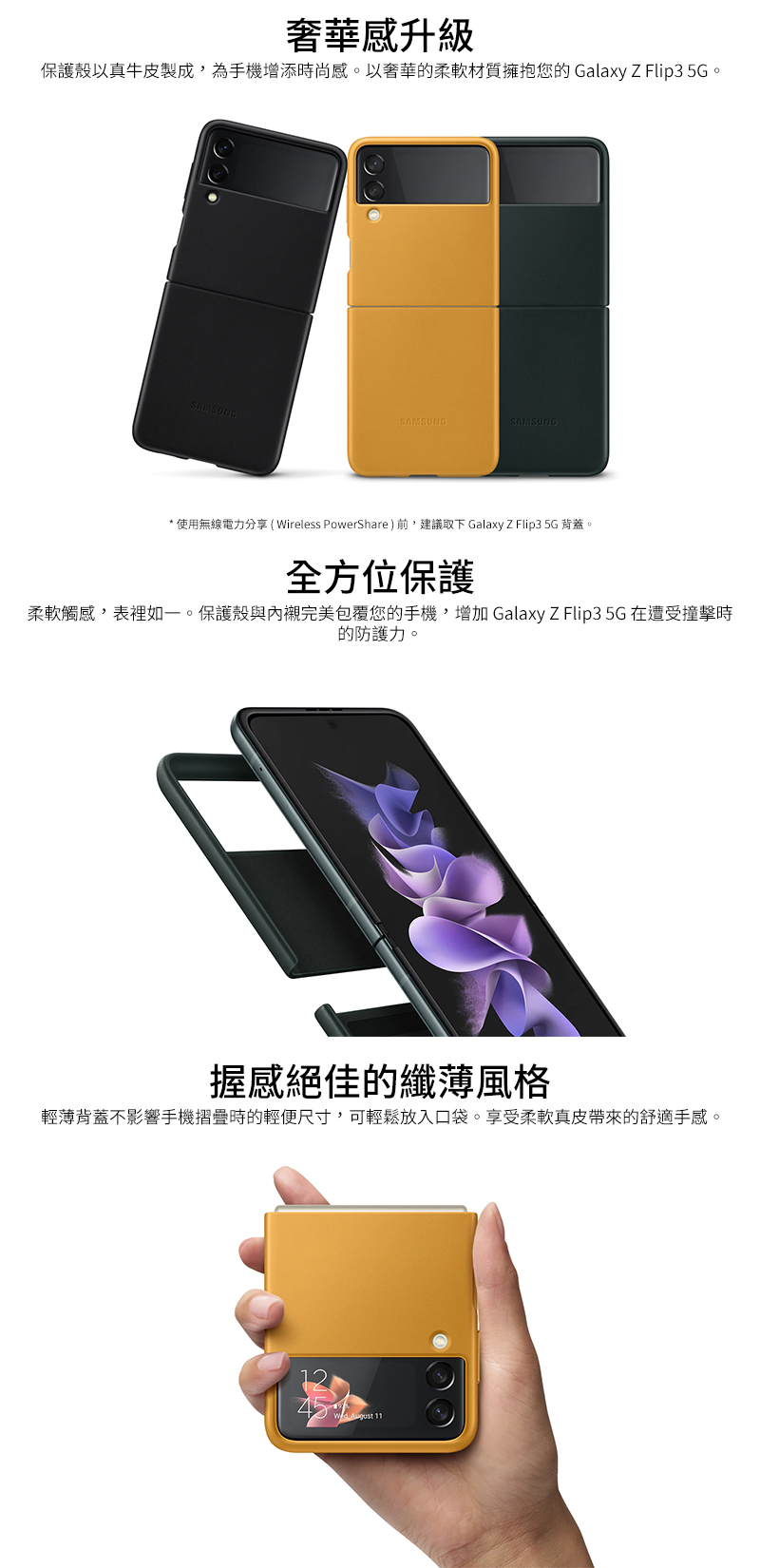 保護殼以真牛皮製成,為手機增添時尚感 保護殼與內襯完美包覆您的手機,增加遭受撞擊時的防護力 輕薄背蓋不影響手機摺疊時的輕便尺寸,可輕鬆放入口袋