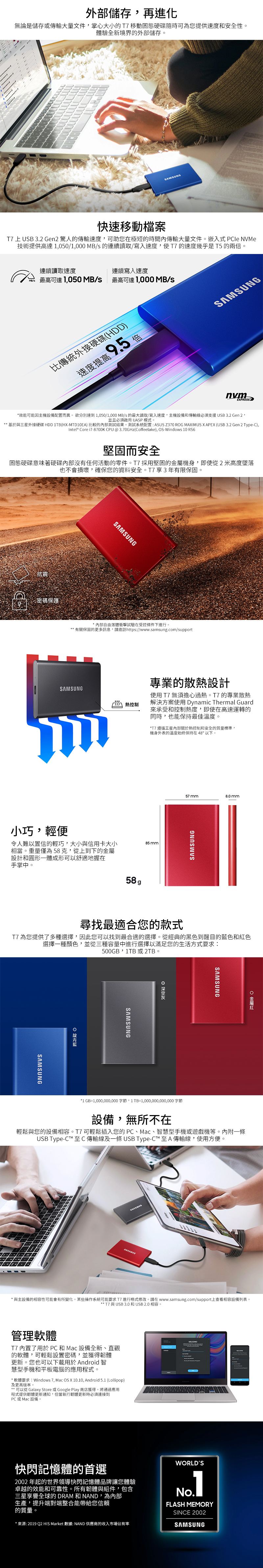 【贈三星行李箱綁帶】SAMSUNG T7系列 移動固態硬碟 500GB 深空灰 MU-PC500T/WW