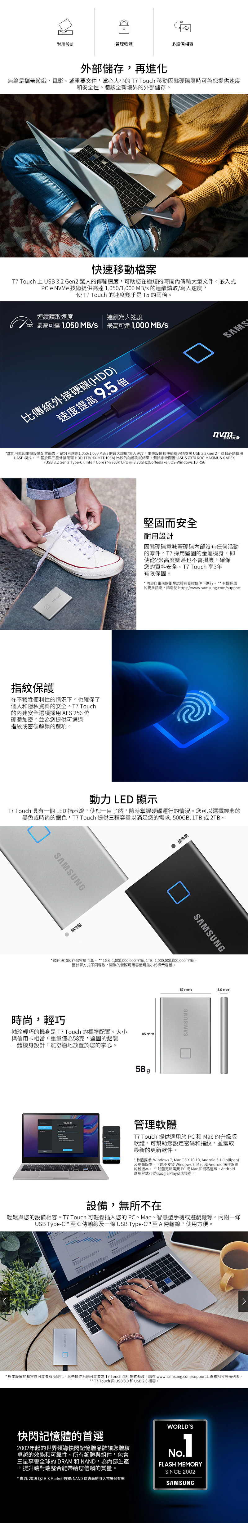 【贈三星行李箱綁帶】SAMSUNG T7 Touch系列 移動固態硬碟 2TB (USB 3.2)